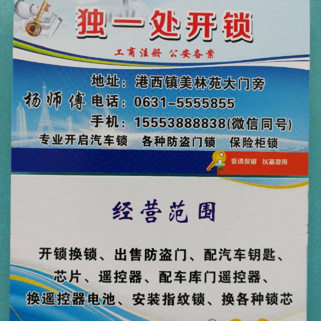 是一家经工商注册,公安及锁具协会备案的正规开锁公司,店面位于港西镇美林苑大门旁。专业从事企事业单位及个人的港西镇开锁、换锁、配钥匙、锁具销售等业务。